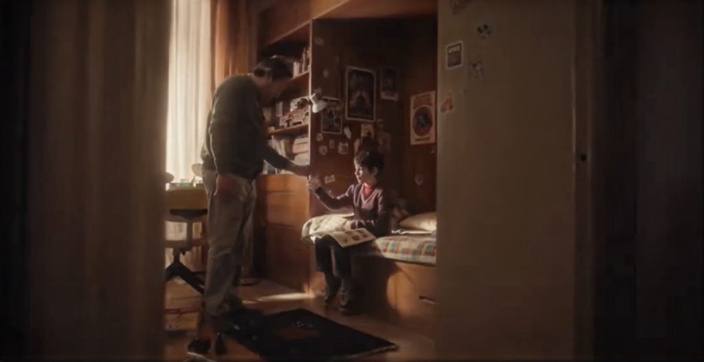 A medida que avanza el vídeo, vemos cómo el padre se abriga, el hijo prepara la salida y aparece una bufanda que delata el destino: un partido de fútbol. Y es entonces cuando la narración da su giro más inteligente. Sin avisar, sin subrayarlo, los personajes cambian. El padre se vuelve joven. El hijo, un niño. Son los mismos gestos, la misma complicidad, pero cuarenta años atrás.